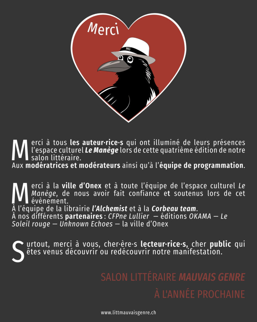 L’équipe de l’association Le corbeau qui lit remercie le public, les auteur·rice·s, les partenaires et le public pour cette quatrième et belle édition.